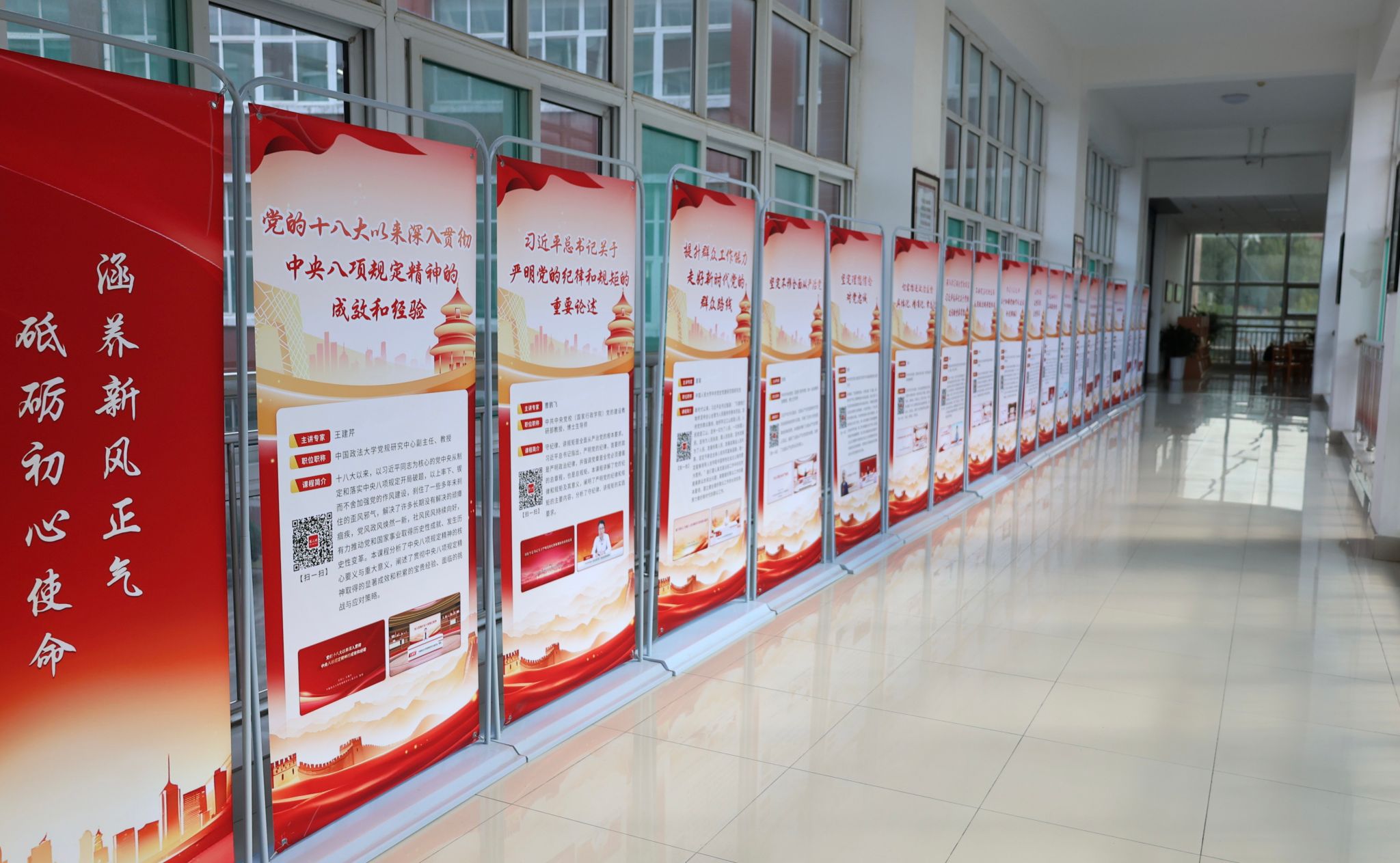 深入贯彻中央八项规定精神学习教育专家讲座展位于学校图书馆二楼AC区连廊布展,设20个展架,展示了若干组中央党校、中国社会科学院等院校专家教授的专题讲座,每组讲座包含4-6节十分钟左右的微视频,聚焦学习教育主题进行深入讲解。