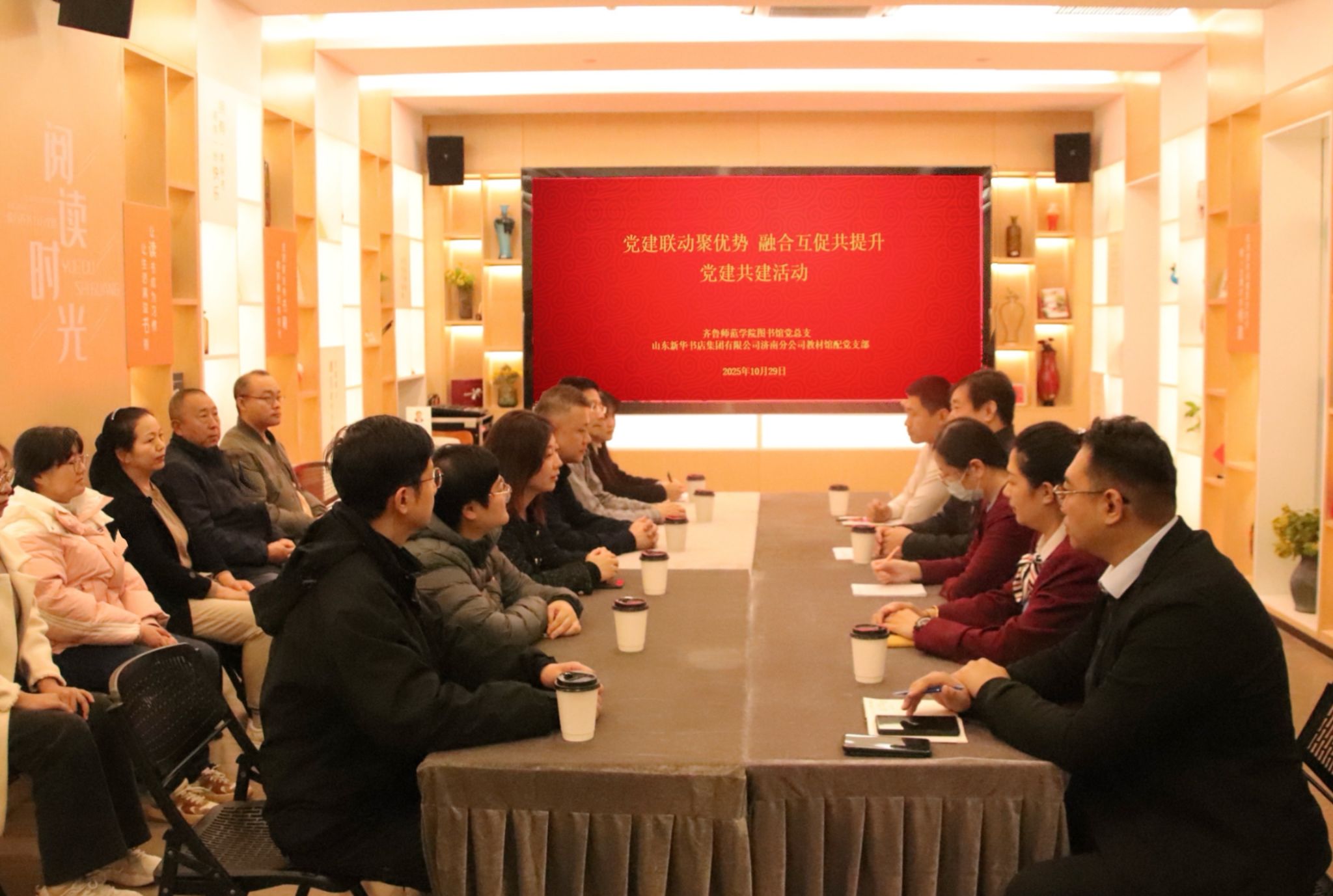 为充分发挥党建引领作用,推动党建与业务工作深度融合,10月29日,学校图书馆党总支与山东新华书店集团有限公司济南分公司教材馆配党支部共同开展以“党建联动聚优势,融合互促共提升”为主题的党建共建活动。