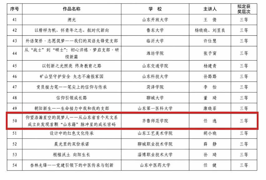据悉,本次全省高校党员教育系列活动,以“高质量发展强担当——改革创新当先锋”为主题,旨在教育引导广大师生党员在教育强省建设中当先锋、做表率,不断提高党员队伍建设质量。活动由山东省委教育工委主办,面向全省160余所高校征集作品,经学校申报、专家评审、集体研究、结果公示,最终确定“党课开讲啦”“我和我的支部”优秀作品各60部,其中一等奖10部、二等奖20部、三等奖30部。