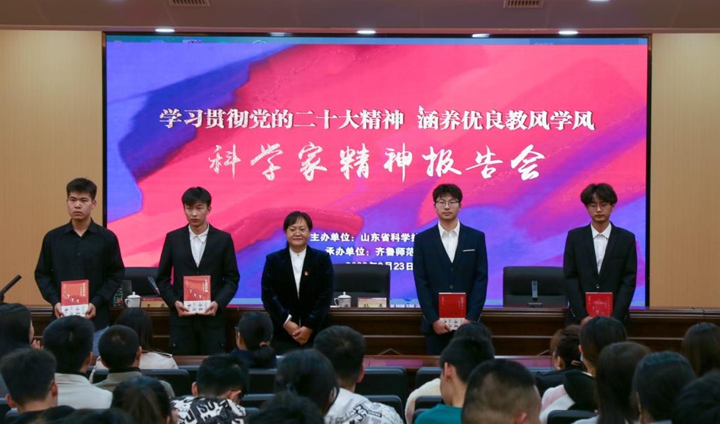 报告会后,举行了赠书仪式。王晶将山东省科协策划出版的《红色科学路——山东科学家传记》丛书和科学家精神图册赠予现场同学。