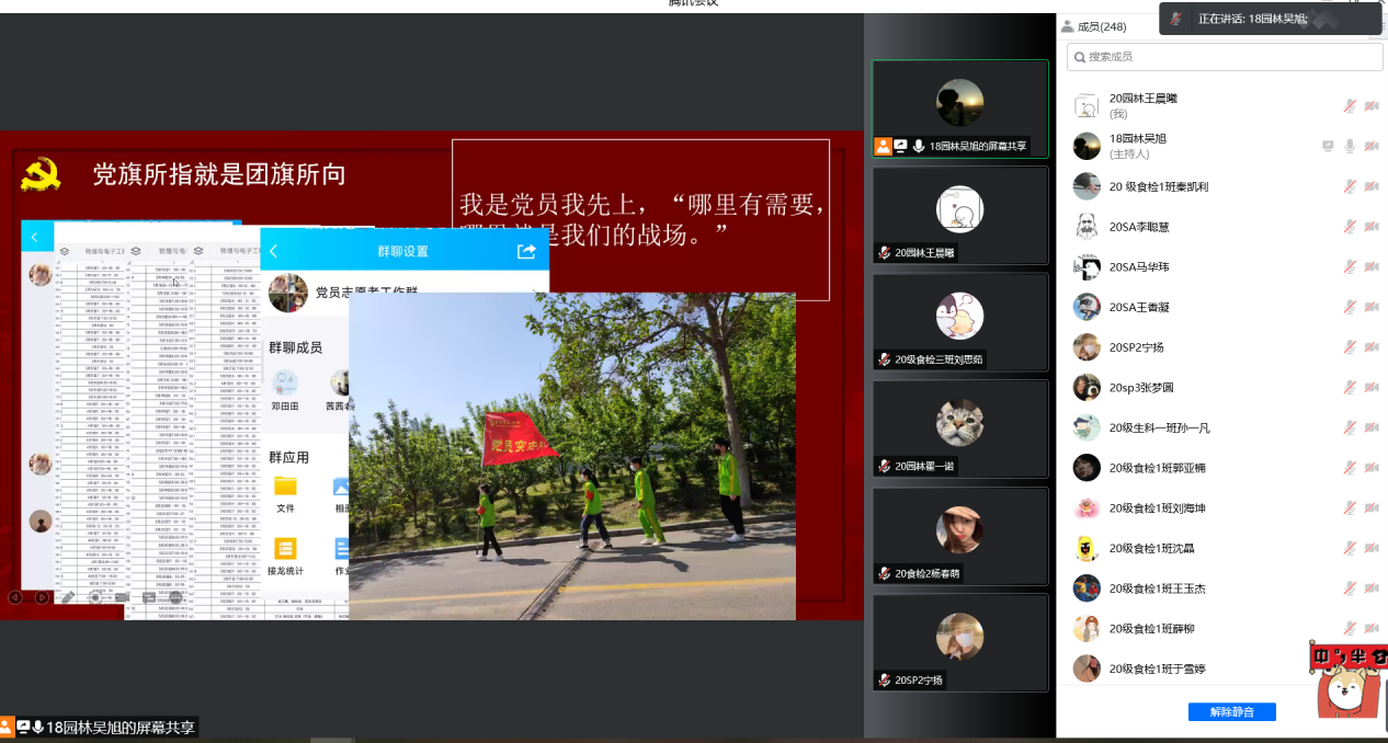 党员突击队作为先锋队始终活跃在第一线,于颍颖提到在疫情爆发之际充分发挥党员的先锋模范作用,供给物资、安抚情绪、志愿服务,都能看到他们忙碌的身影。张晓慧带领全体师生回顾了五四运动的历史背景、爆发过程及历史意义,号召大家立鸿鹄之志,勇担时代责任和历史使命,做新时代的奋进者和开拓者;何星晨以党员事迹为出发点,介绍了毛泽东、周恩来和蔡和森等伟人的革命运动。他们不畏强权,用自己的知识和文章抵制侵略,以笔为号唤醒沉睡的国人。如果说旧时的五四是思想解放的开始,那么今天的五四便是思想坚定的继续。吴旭看到了当代青年的力量,中国短道速滑运动员武大靖几百次为国征战、青年舞者孟庆旸51次《只此青绿》只为传承、更有“90”“95”医护人员筑起“青春堡垒”。革命年代的星星之火,唤起了无数国人的觉醒,风雨变幻、沧海桑田,不变的是精神,不老的是青春。张宏熙老师在总结发言中强调,今天,中国正以不可阻挡的步伐向前迈,同学们要积极发扬五四精神,争做时代栋梁。