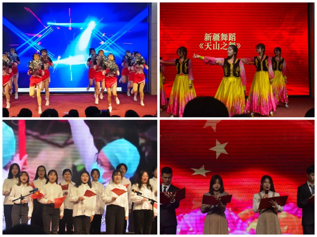 表彰大会节目精彩纷呈。开场舞啦啦操,用肢体语言演绎欢乐,用汗水演绎青春,演绎着振奋人心的激情与自信;新疆舞蹈《天山之舞》婀娜多姿,风土人情别具一格;学生诗朗诵《鲜红的旗帜》向党致敬;一曲《灯火里的中国》热血澎湃,将全场的气氛推向高潮;合唱团带来的《万疆》深情为华夏,吾国为万疆。