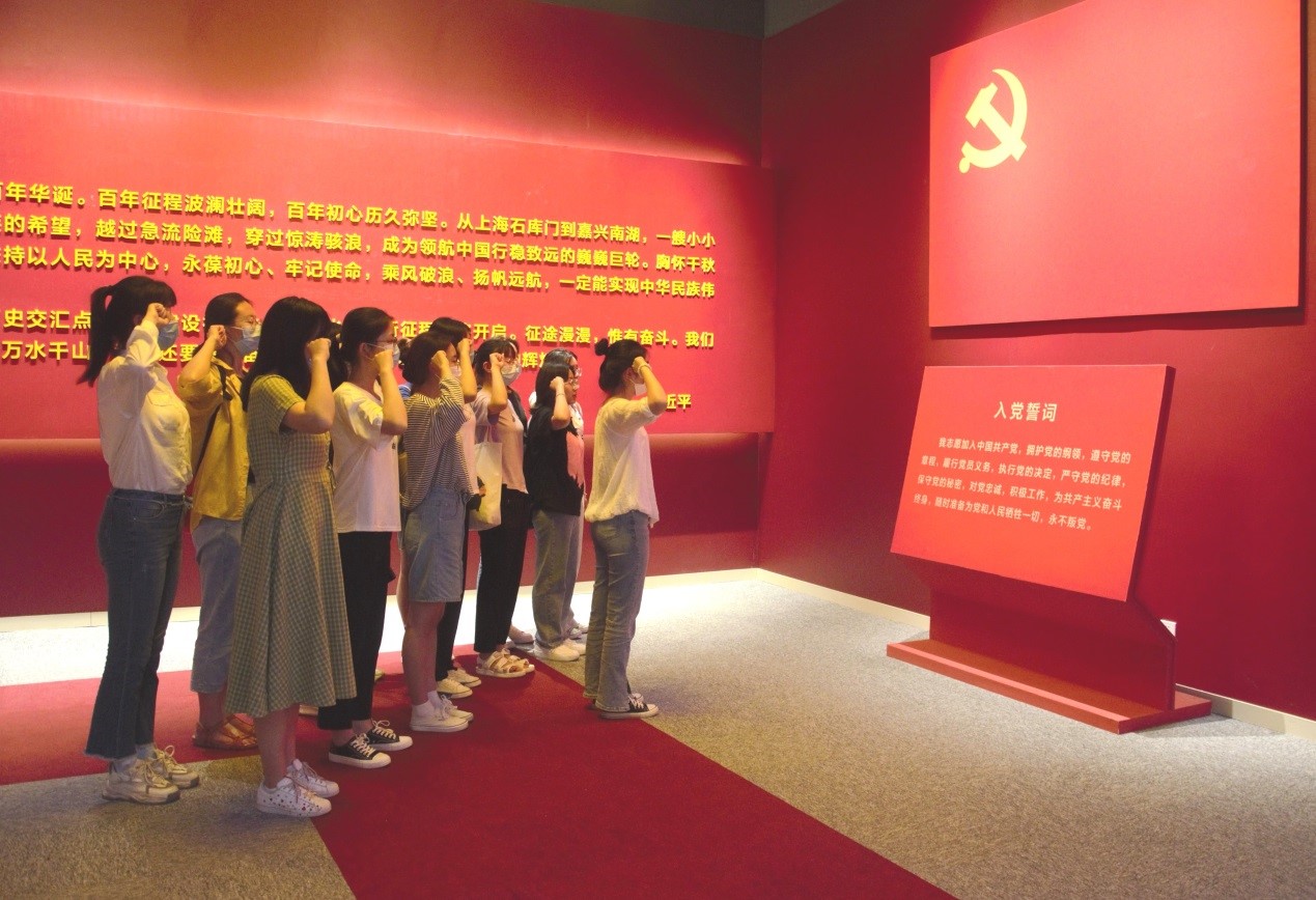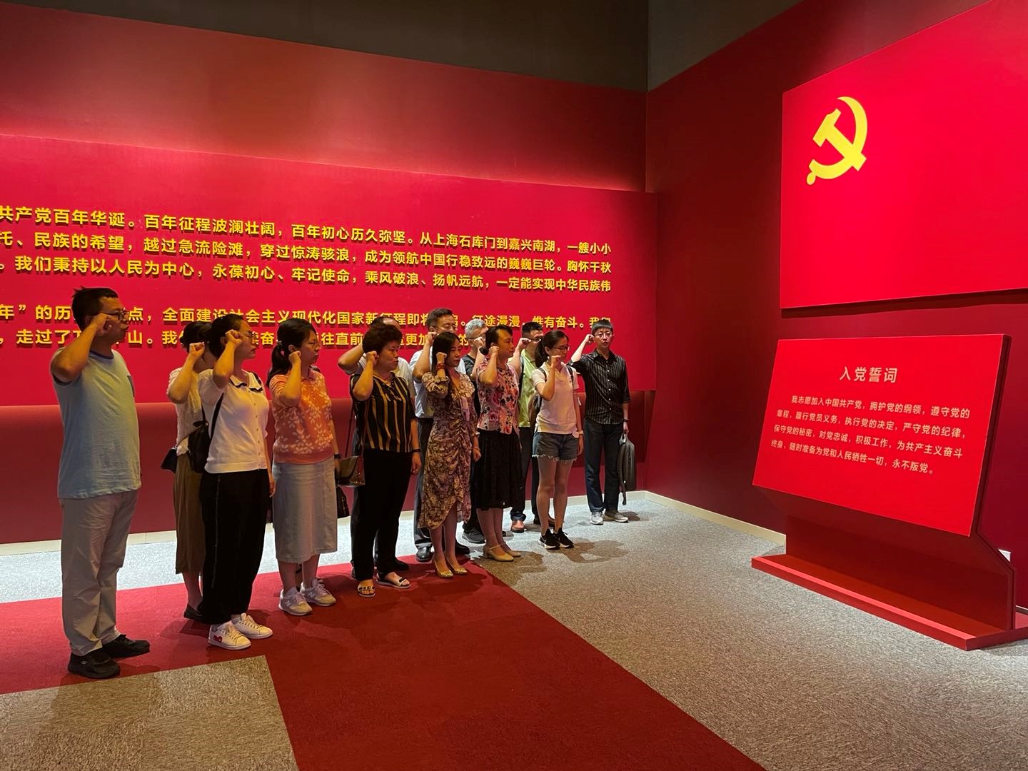 参观结束后,生命科学学院全体师生党员面向党旗,紧握右拳,重温入党誓词,庄重的气氛迅速蔓延,铿锵有力的宣誓声响彻大厅。