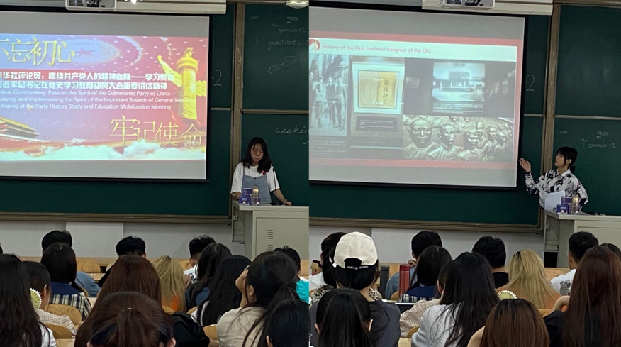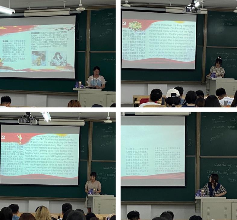 为了让同学们更好地认识到党史学习教育的重要意义,滕文悦、陈鑫、孙文静和秦沛雯四位同学带领大家学习了来自中央对外联络部英文版网站的新华社评论员文章《赓续共产党人的精神血脉——学习贯彻习近平总书记在党史学习教育动员大会重要讲话精神》,用英汉互译的视角讲解文章内容,并对文章中所提及的中国共产党发展进程中体现出来的各种精神进行补充列举。