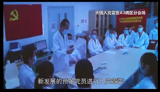 参加活动的所有党员观看了战疫先锋纪录片《隔离病房里的领誓人》,抗疫最前线阵地上,上海市17家医院的医护人员在医院的病房中庄严宣誓,火线入党,他们用信念的力量,坚守着对生命的承诺。而领誓人李锋,上海市公共卫生临床中心应急病房临时党支部书记,呼吸与危重症医学科主任,更是在巨大的压力和责任面前切实担当起一名党员的使命,从危重病人的诊疗、医护人员的协调到医疗物资的调配……成为整个病区“最忙碌的人”,两个多月的时间里,连在医院门口晒晒太阳都成了最奢侈的事。