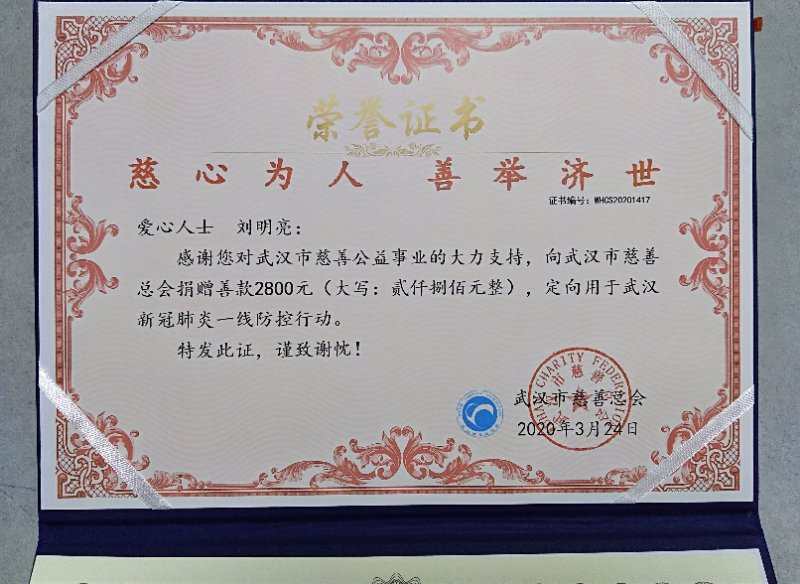 谈起参加抗疫线上慈善拍卖会的初衷,刘明亮教授深情地说:“面对来势汹汹的疫情,中国人民表现出了强大的民族凝聚力以及社会责任感,无数的“逆行者”们驰骋一线,无数暖心的举动让这个冬天充满了温情。作为一名人民教师和艺术工作者,非常愿意贡献出自己的一份绵薄之力。”刘明亮教授慷慨捐赠爱心拍品《静物系列》支持“不畏艰难、合于众心”抗疫线上慈善拍卖会活动当代书法、油画专场,3月24日将所得善款2800元捐助至“武汉市慈善总会——新型冠状病毒防控专项基金”,定向用于武汉新冠肺炎一线防控行动,并收到了武汉慈善总会颁发的“慈心为人、善举济世”荣誉证书,这是对刘明亮教授爱心捐赠的充分肯定。