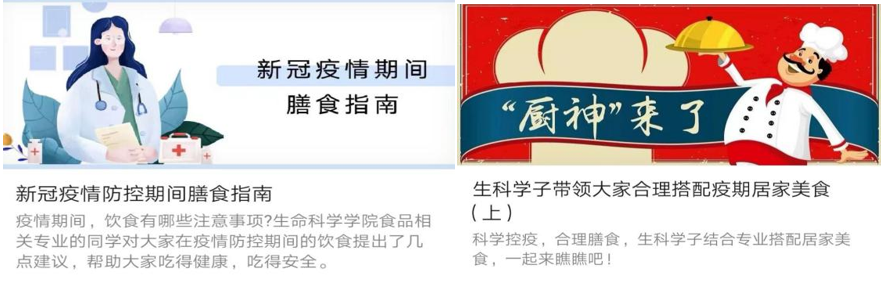 疫情当前,除了做好个人防护与居家消毒外,科学合理的营养膳食是保障免疫系统正常工作的基础,注意日常饮食管理,能提高机体免疫力,降低疾病风险。为此学生党支部带领学院各个团支部开展主题团日活动,结合食品相关专业特点,发布《新冠疫情防控期间膳食指南》等微信推送,对大家在疫情防控期间的饮食提出了几点建议,帮助大家吃得健康,吃得安全,并推荐居家制作简便、营养合理、色香味俱佳的美食,帮助大家以最佳的健康状态与疫情作战,为打赢疫情防控攻坚战做出应有的贡献!