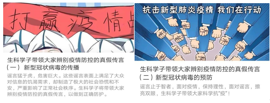 疫情发生后,部分学生党员、共青团员主动承担了学院疫情防控的宣传工作。他们发挥专业优势,做好疫情防控的“宣传员”,充分发挥脚力、眼力、脑力、笔力,利用微博、微信公众号、QQ等新媒体平台,发布“生科院防疫知识普及”系列推送文章,加强对同学们疫情防控知识的教育和普及,潜移默化地引导广大青年科学防疫、抵制谣言,同时引导大家合理安排假期时间,制定好学习规划,确保学习“不断线”,学习成效有提升。