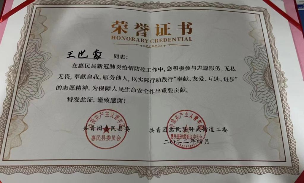 “2022年三月下旬,疫情突如其来,我的家乡滨州阳信正遭受着新冠病毒疯狂肆虐,看在眼里、急在心里,作为一名大学生我一定要为我的家乡做点什么。”2022级民族传统体育专业魏皓楠说。
