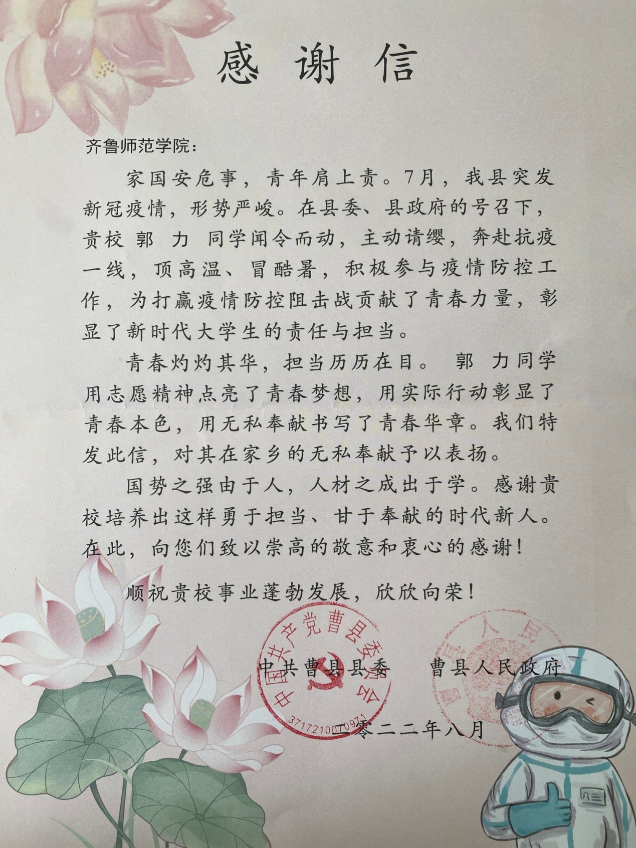 2022年8月,中共曹县县委、曹县人民政府向我们发来感谢信,对体育学院2021级休闲体育专业学生郭力表示感谢,信中提到:家国安危,青年肩上责。7月,我县突发新冠疫情,形势严峻。在县委、县政府的号召下,贵校郭力同学闻令而动,主动请缨,奔赴抗疫一线,为打赢疫情防控阻击战贡献了青春力量,彰显了新时代大学生的责任与担当。