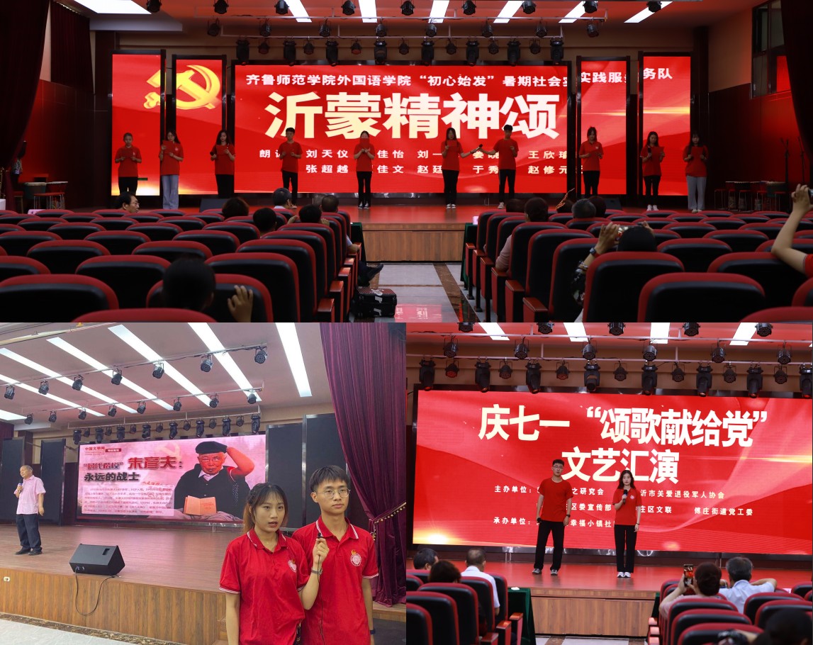 在6月25日举行的罗庄区幸福小镇社区“庆七一、颂歌献给党”文艺汇演活动中,外国语学院社会实践服务队表演了精彩的节目,展现了BEAT365英国官网外国语学院青年学子的良好精神面貌。队员们为此次演出精心准备了积极向上的英语歌曲和令人热血沸腾的诗朗诵。在诗朗诵“沂蒙精神诵”中说到,“最后一口粮做军粮,最后一块布做军装,最后一个儿子送战场”。一个个感人至深的故事背后,正是沂蒙精神的生动体现。在艰苦卓绝的革命历程中,沂蒙党政军民水乳交融、生死与共,共同铸就了伟大的沂蒙精神。滔滔沂河水,流淌着党与人民血肉相连的鱼水深情;巍巍沂蒙山,耸立着党和人民生死与共的历史丰碑。通过参加社区文艺汇演,队员们不仅又接受了一次沂蒙精神的洗礼,更抒发了对党的无限热爱之情,充分展现了齐鲁师院青年爱党爱国爱校的情怀和朝气蓬勃、青春向上的精神面貌。