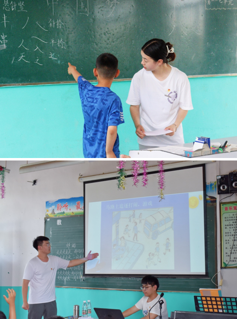 两支服务队分别进驻孙庄村小学和王坑村小学进行支教活动。队员们通过听课和与教师们开展集体备课等教研活动,逐步将理论知识转变为实际教学能力。队员们学以致用,为小学生们开展红色经典阅读课、书法课、防溺水安全课等特色课程和课余文体活动,并为留守儿童开展一对一的课业辅导。支教活动丰富小学生们的学习生活的同时,也为乡村小学的教育工作注入了新动力。