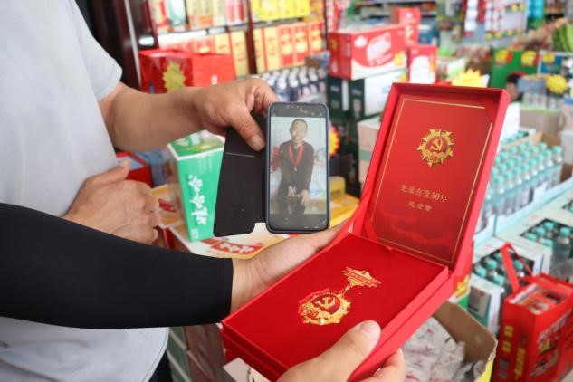二队队员到达松坡社区居委会后,向超市老板发放了普通话调查问卷。老板得知我们的活动后,积极配合我们的工作,老板的父亲不但向我们展示了其父亲的光荣在党五十年纪念章还对我们讲述了他入党的故事。