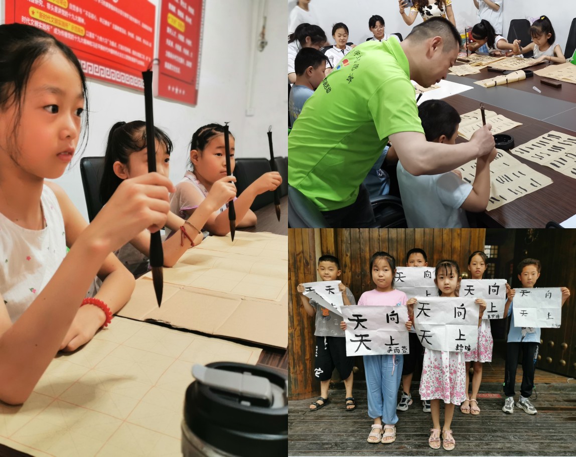 队员们在指导老师带领下教授毛笔书法