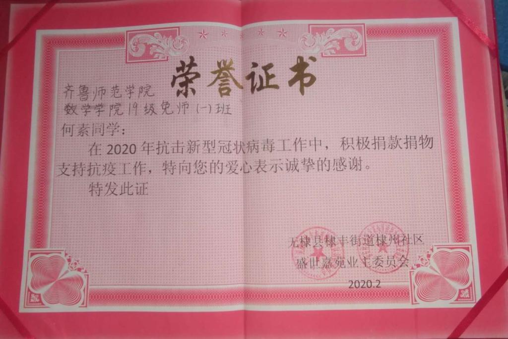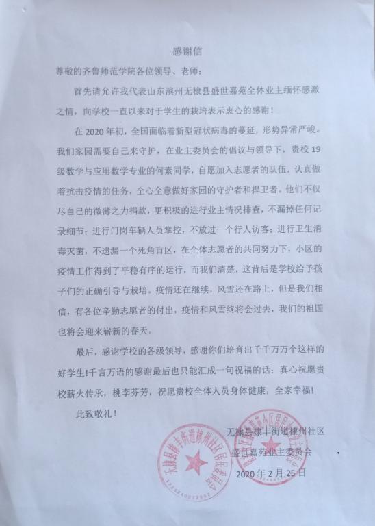 3月6日,我院收到山东省滨州市无棣县棣丰街道棣州社区居民委员会寄来的感谢信,信中感谢了我院2019级数学与应用数学专业免师一班学生何素在疫情防控的关键时刻,积极投身其所在社区进行疫情抗击守卫家园的事迹。
