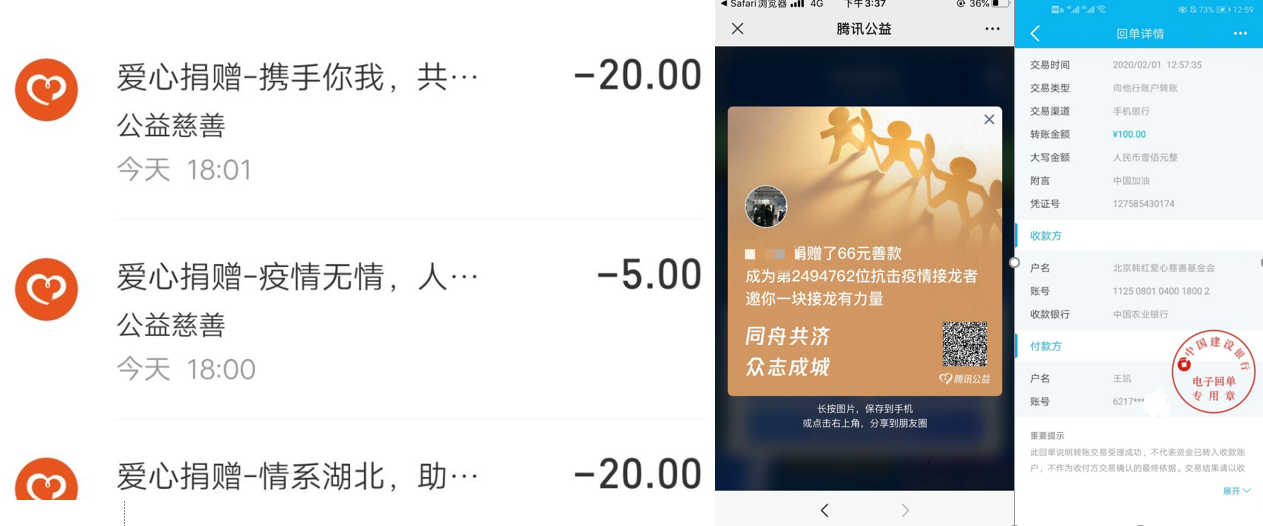 “有难一起扛,坚信爱会赢。”疫情发生以来,历史与社会发展学院学子不仅注重自我科学防护,而且还时刻关注疫情动态。截止2月6日21时,我院共有176名学子奉献爱心,累计捐款金额9856.94元,捐赠口罩80只。“疫情无情,学子有情。”他们通过各大疫情救助捐赠的网络平台进行爱心捐款,为疫区捐赠急需物资、为村委工作者提供食物和热水。历史与社会发展学院学子的“爱洒人间,情暖人心”,于“绵薄”之力行大善。
