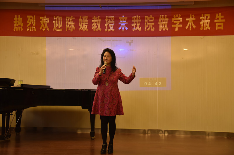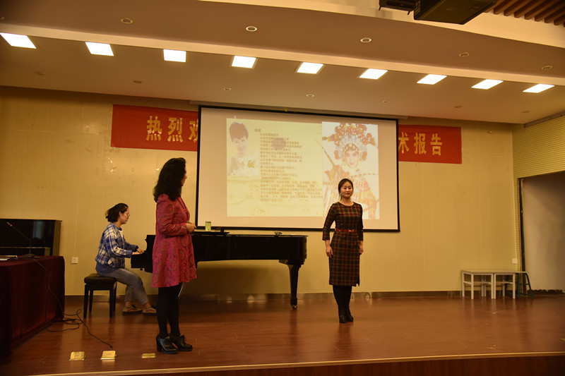 首先,陈媛教授讲解了戏曲、歌剧的历史及对声乐艺术的影响。指出声乐表演中从服装设计到面部表情到身体的每一个动作都要有准备,有神韵,要充满激情,整个身心都要投入到音乐当中,同时要求学生加强形体课的学习,练习双臂的起落,双脚的站姿,强调身体的动作对音乐表现力的影响。指出声乐与表演是一体的,声音是基础,手眼身法步是“武器”,尤其演唱民歌时应多从中国传统戏曲中挖掘精华。随后陈教授现场辅导两名学生,从学生的演唱中向我们讲解了如何适度的有控制的做出动作,如何利用眼睛表达音乐的情感。台上一分钟台下十年功,单单一个抬手,就包含了大臂小臂的配合和手腕的控制以及相互的作用。最后,在陈媛教授深情演唱中,此次讲座圆满结束。