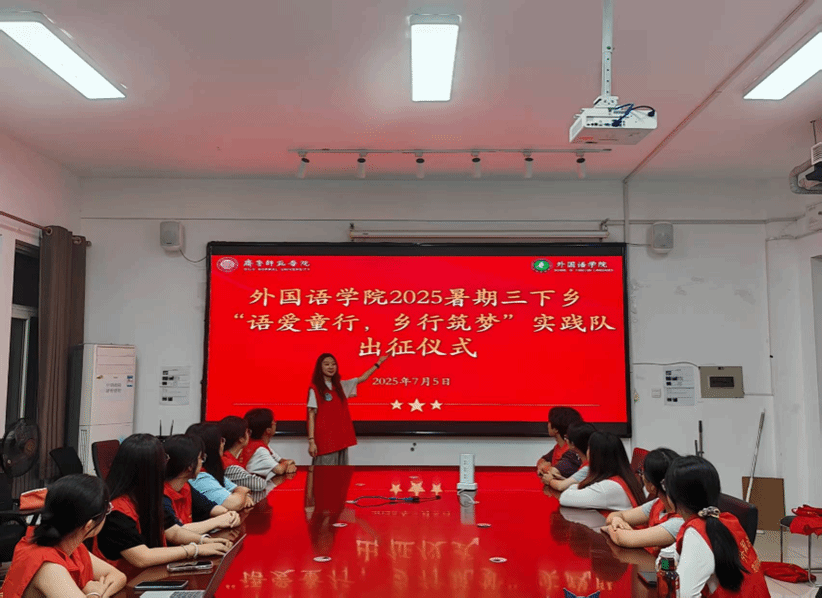 7 月 5 日,出征仪式在二教 B216 教室举行。团队指导老师吴昊叮嘱队员们,“三下乡”是青年扎根基层、服务社会的重要契机,大家要发挥外语专业优势,同时保障自身安全。出征前,队员们精心整理课外图书、教学材料等物资,搭建起助力乡村教育的“桥梁”。