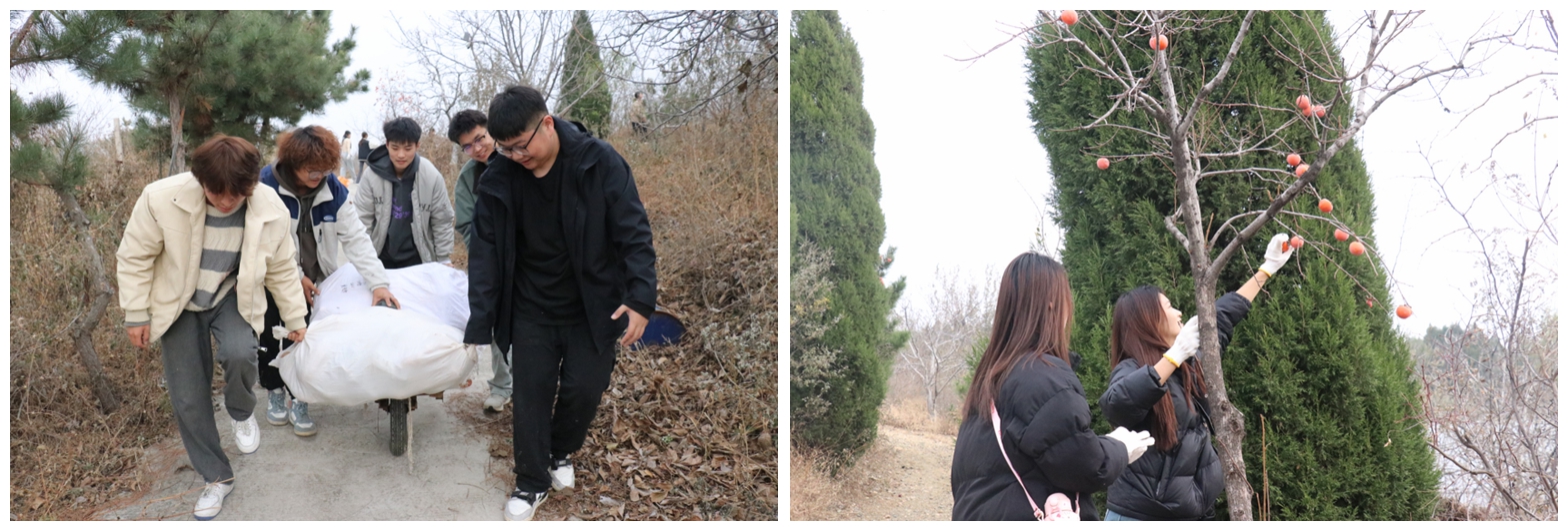 梦想为犁,耕耘亦甜。活动伊始,辛源向同学们讲解了刨地的相关技巧。随后,同学们纷纷挽起袖子、拎起工具,在田间地头刨地瓜、摘南瓜、拔萝卜、摘核桃,尽情感受农作的乐趣。面对挂在高高树上的金黄柿子,同学们分工合作,有的负责摘低处的柿子,有的则负责攀高,他们互相传递柿子,乐此不疲、兴致勃勃,共享丰收的喜悦。整个过程中,大家既领略了老舍笔下“济南的秋天”的魅力,也感受到了大自然的魅力,体验了团队合作的乐趣。