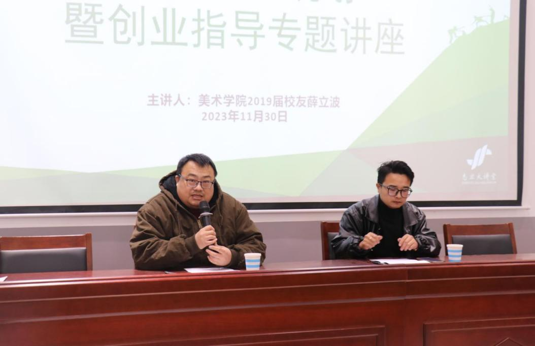 为激发同学们的创新创业热情,培养同学们的创新创业意识,充分发挥优秀校友的标杆和模范作用,11月30日,美术学院邀请2019届优秀毕业生,智艺绘艺术培训学校校长、山东省青年美术家协会会员薛立波进行志业大讲堂之创业指导专题讲座。