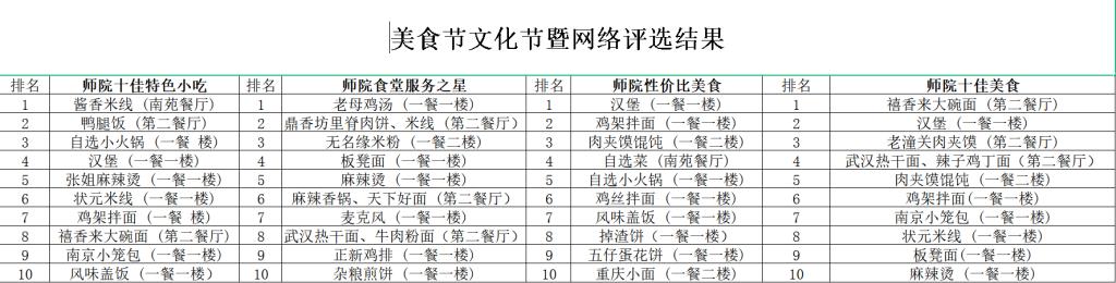 美食评选分为“师院十大特色小吃”“师院十大美食”“师院十大性价比菜品”“师院食堂服务之星”四大类,学生餐厅所有菜品都参与了评选。活动采取网上评选方式,共收到3万余人次投票。