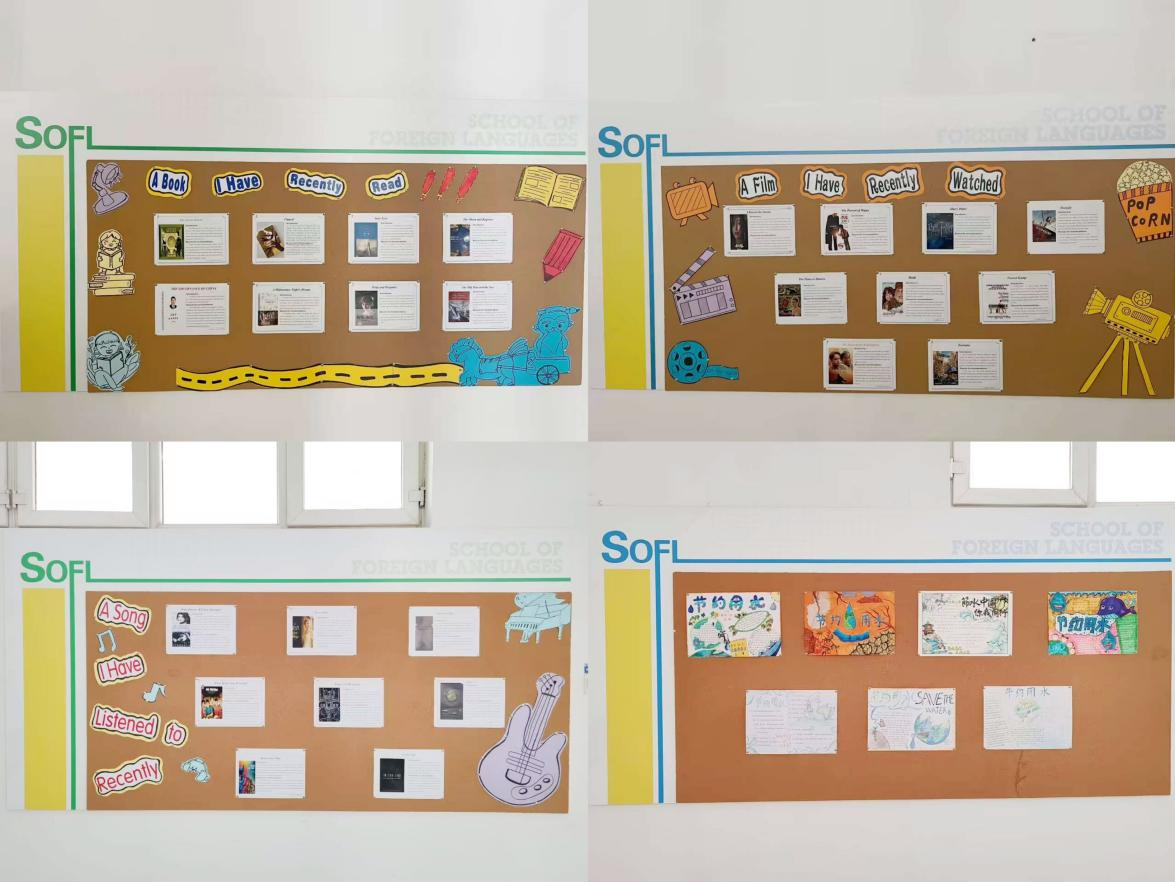 为充分发挥同学们的创新能力和交流能力,浓厚学院学习氛围,陆续举办了“最近在读”“最近在看”“最近在听”分享展示活动。学生们从内容筛选、理念设计、色彩搭配等多个方面入手,将学院的文化墙打造成了一个兼具艺术性和教育性的场所,有的以电影为主题,培养同学们的跨文化视野;有的以英文名著读后感为主题,加深同学们对英语文化和历史的了解;有的则以好书推荐为主题,激发同学们的阅读兴趣……设计过程中,同学们充分发挥了自己的创新思维和团队协作精神,用实际行动诠释了“环境育人”的理念。这些文化墙作品不仅装点环境,更展示和传递了学生们积极向上的价值观和人生观。