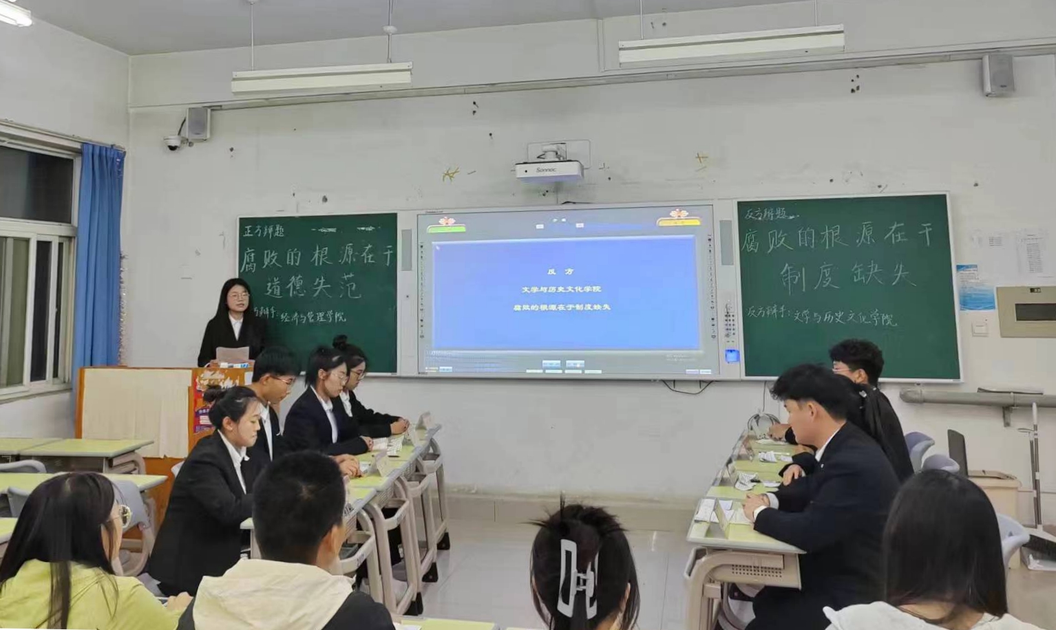 此次大赛由学校纪委、团委主办,文学与历史文化学院承办,前期,各学院广大学生踊跃报名、积极参与,全校共有14个辩论队参赛,历经小组赛、半决赛和决赛累计12场比赛,最终文学与历史文化学院辩论队、经济与管理学院辩论队进入决赛。