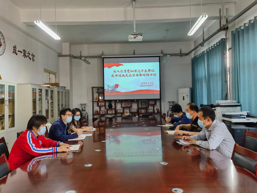 4月27日,历史文化学院集体学习习近平总书记在中国人民大学考察时的重要讲话精神,党政领导班子和辅导员参加线下学习,全体教师参加线上学习。
