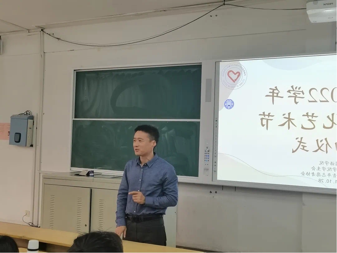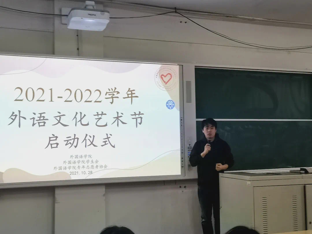 10月28日下午,外国语学院于一号教学楼A405举办2021—2022学年外语文化艺术节启动仪式。外国语学院副院长李百温、团总支书记牛荦及2021级全体本科班学生参与本次活动。