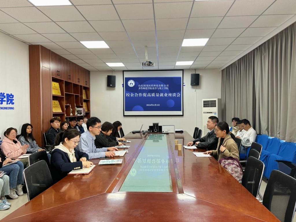 为进一步推动校企联合人才培养,搭建用人单位与毕业生供需对接的平台,促进高质量就业,4月2日上午,化学与化工学院在二号实验楼B310召开校企合作促高质量就业座谈会。山东国茂医药科技有限公司总经理盛彦君、人力资源总监赵丰霞,化学与化工学院院长曹晓荣、党委副书记巩磊、副院长张旭雪、团总支书记杨睿及2024届、2025届部分毕业生参加会议。会议由巩磊主持。