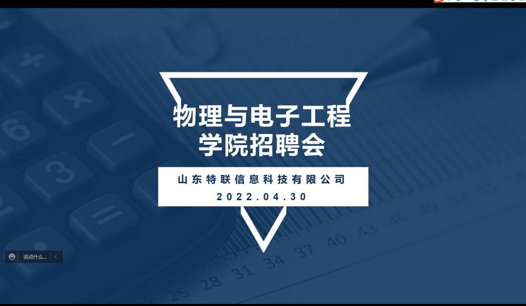 为搭建校企合作平台,拓宽毕业生就业渠道,促进产教融合与学生就业工作,提高毕业生的就业质量,4月30日上午,物理与电子工程学院在一号实验楼B216召开了访企拓岗线上交流会,并组织企业宣讲及线上招聘会。会议由学院团总支书记李华主持,物理与电子工程学院党委副书记臧葳代表学院领导与山东特联信息科技有限公司董事长郭新鹏进行深入交流,全体辅导员、2022届200余名毕业生参加此次会议。