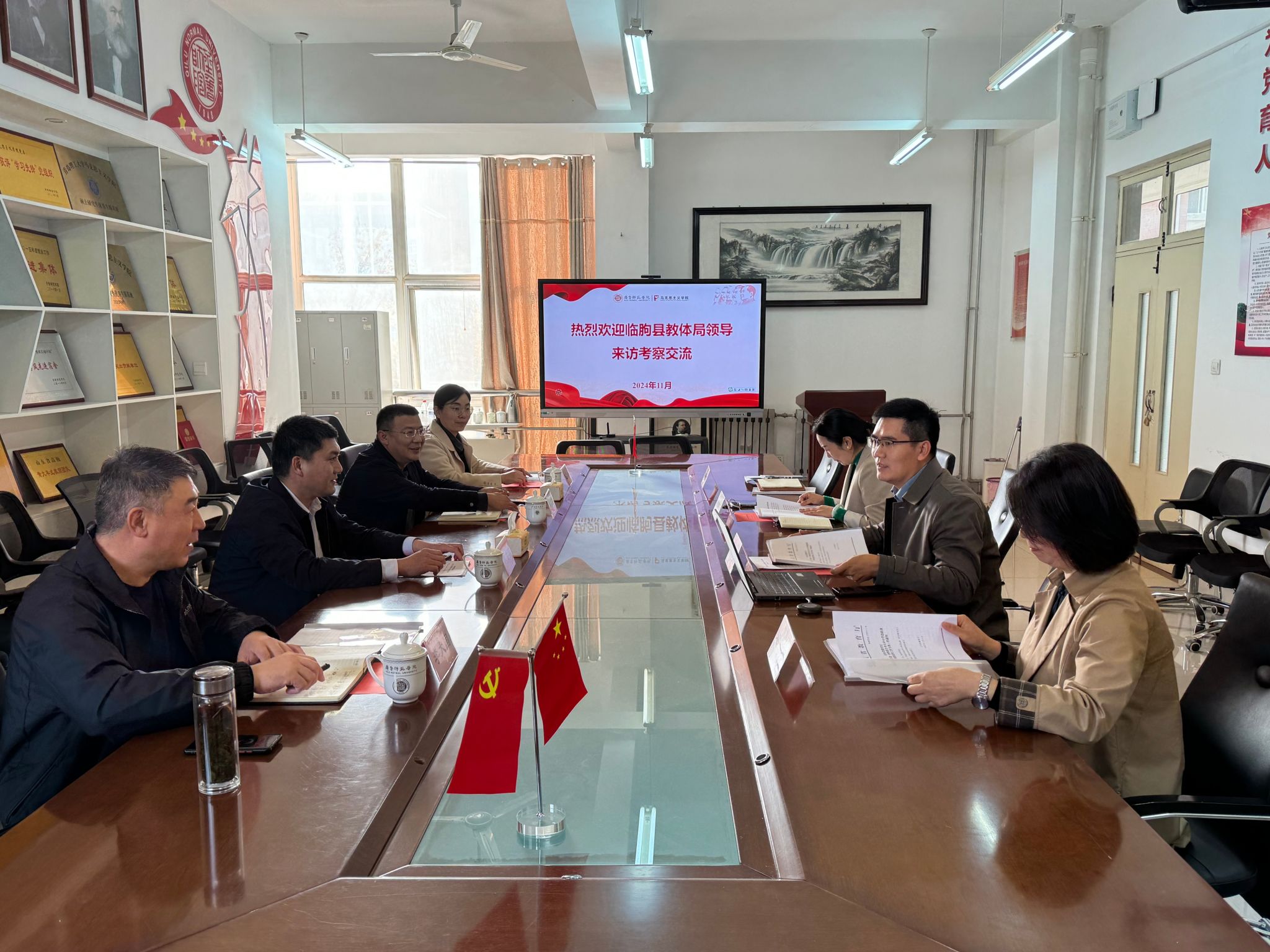 赵立峰对临朐县教体局到访表示热烈欢迎,并从学院历史、发展现状、学生培养及社会服务等方面作了详细介绍。他指出,马克思主义学院依托雄厚的师资力量,培养出了优秀的思想政治专业人才,学院一直以来积极推动与中小学的合作,为基础教育发展提供强有力的人才支持,希望双方能够加强交流,紧抓合作机遇,助力临朐县教育事业发展。
