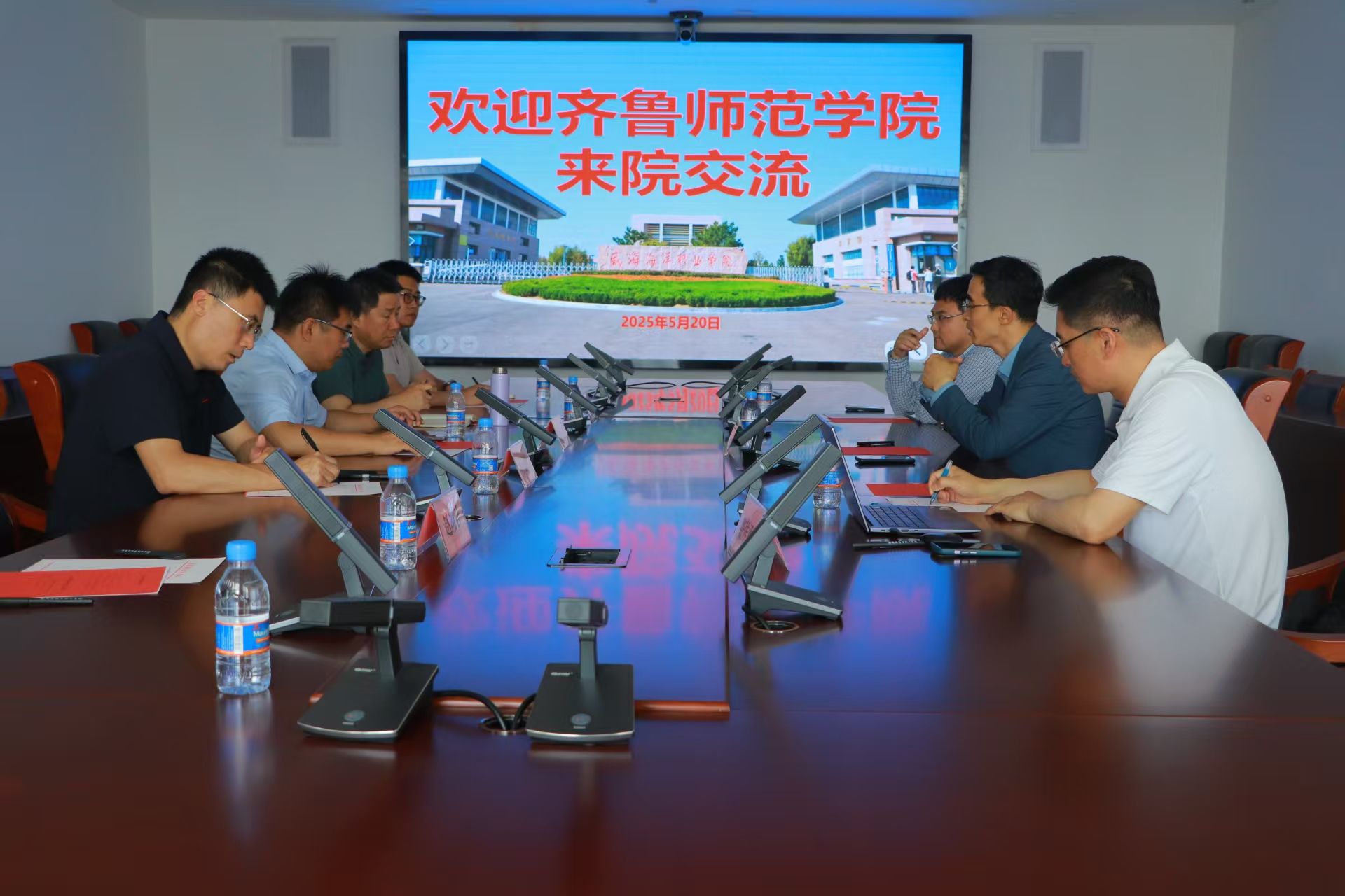 为进一步加强校际交流与合作,提升教育教学质量和人才培养水平,5月20日,学校教务处处长张克玉、合作发展办公室主任刘勇、信息科学与工程学院(人工智能学院)院长杜建彬等一行赴威海海洋职业学院进行交流调研。威海海洋职业学院党委委员、副院长张华芹,党委委员、教务处处长(教师发展中心主任)于春晓,中电泰山数字科技有限公司董事长赵凌云热情接待来访嘉宾,双方就人才培养、专业建设、产教融合等方面展开了深入探讨与交流。