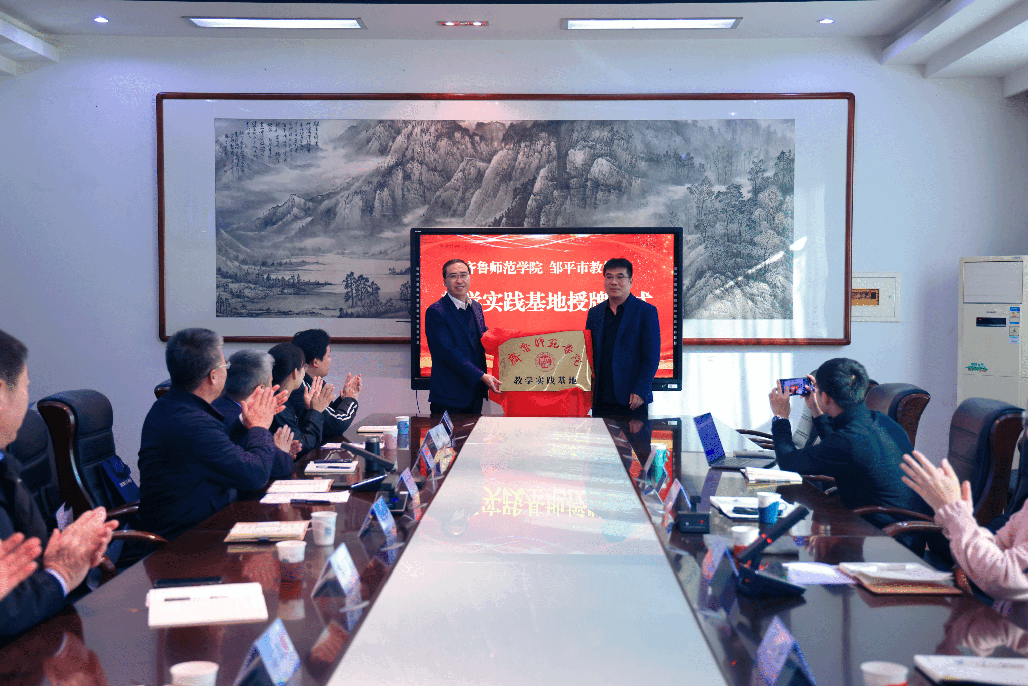 座谈会后,教学实践基地揭牌仪式正式举行。张克玉分别同邹平市教育和体育局、黄山中学、黄山实验小学、龙台实验学校代表为教学实践基地揭牌。