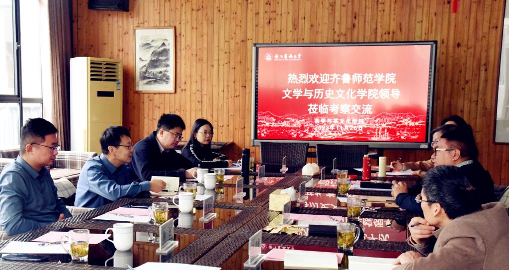 11月25日,为学习借鉴先进经验与典型做法,着力谋划推动学院办学水平和专业建设高质量发展,文学与历史文化学院院长张文哲、党委书记胡义忠、副院长兼乡村振兴研究院副院长朱振华等一行赴浙江农林大学考察交流。浙江农林大学茶学与茶文化学院院长王磊、副院长张帅,文化产业管理(茶文化)专业负责人周新华及茶文化专任教师代表等陪同调研。