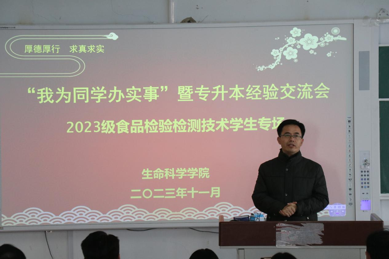 为进一步加强学风建设,践行“我为同学办实事”理念,帮助学生明确学习目标,做好学业规划,为专升本考试打下坚实基础,11月23日,生命科学学院在一号教学楼A207教室举行专升本经验交流会。学院党委书记张海龙、全体辅导员及2023级食品检验检测技术专业全体同学生参加。交流会由学院党委副书记朱广伟主持。