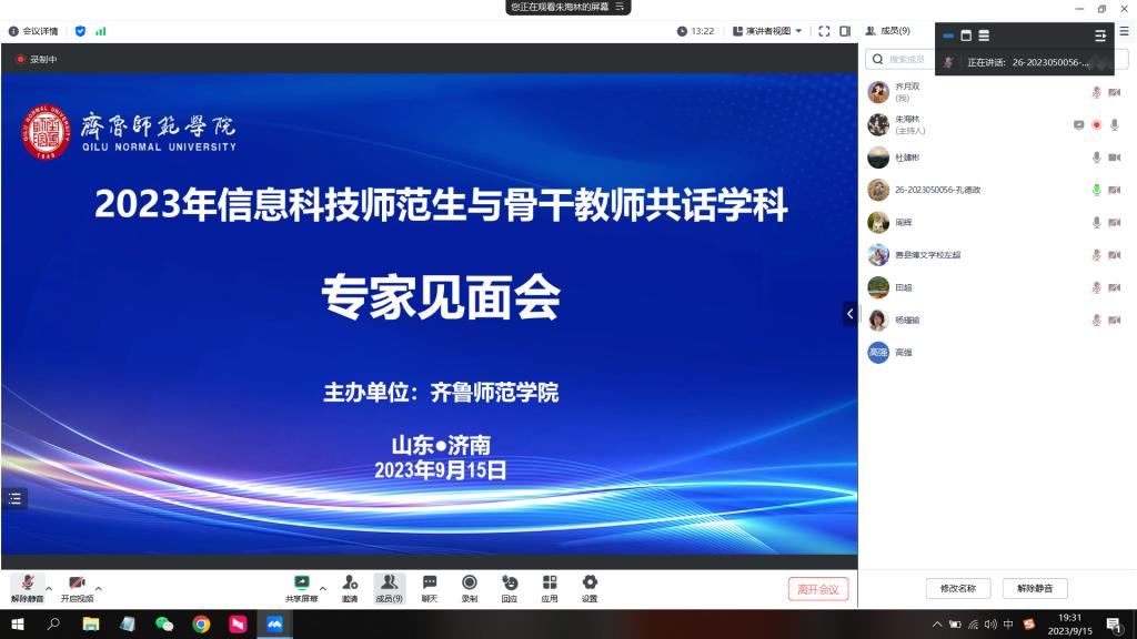 为提升计算机科学与技术专业师范生的教师专业能力素养,充分利用学院“省培计划”资源,促进师范生职前职后一体化培养,9月15日,信息科学与工程学院举办了“信息科技师范生与骨干教师共话学科”专家见面活动,邀请参加省级骨干教师培训的一线教师与师范生进行线上交流答疑。骨干教师代表栖霞市教学研究室田超、济南泉景中学杨瑾瑜、兰陵县实验中学周辉、烟台港城中学高强、费县博文学校左超受邀出席。信息科学与工程学院院长杜建彬、教学秘书齐月双及21级公费师范生参加活动。活动由学院教师袁雪主持。