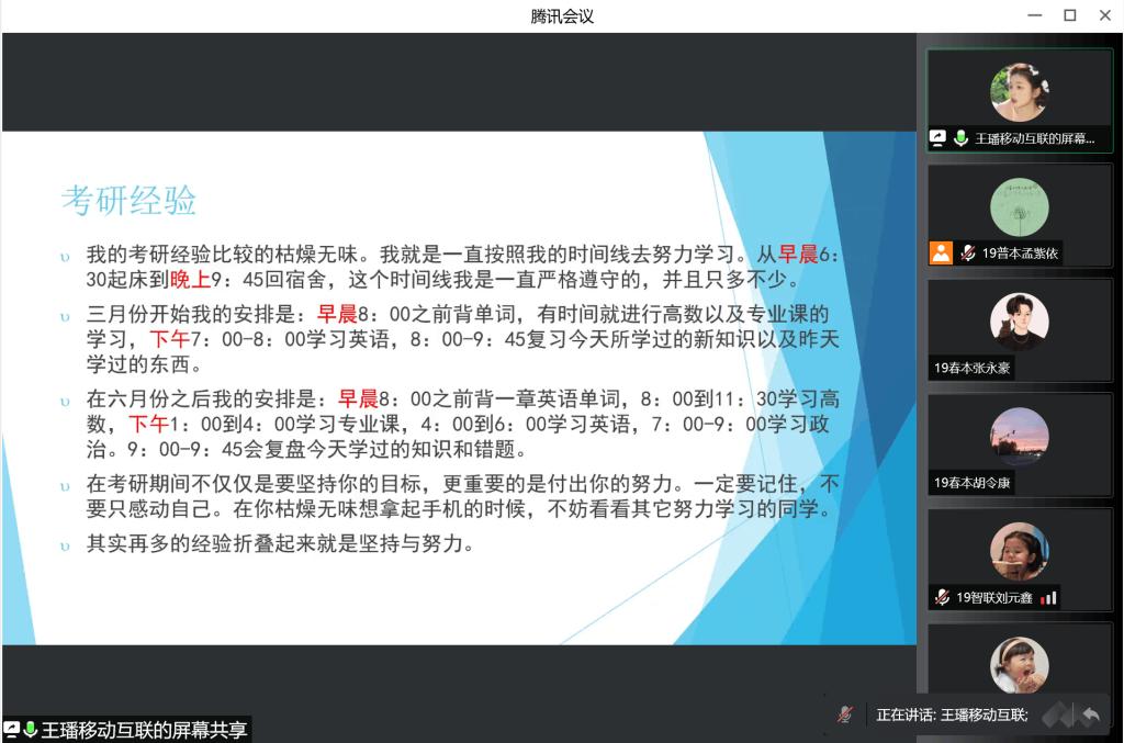 为帮助2019级考研学子做好“研”途路上的学业规划,获取“上岸”经验,缓解备考压力,搭建起学生间经验交流的有效平台,5月12日,信息科学与工程学院于线上举办了2022年考研经验分享交流会。此次交流会邀请到2018级计算机科学与技术(春本一班)于昊翔、2018级计算机科学与技术(春本二班)张宇铖、2018级计算机科学与技术(智能物联)班王兵、2018级计算机科学与技术(移动互联)班王璠进行经验分享,辅导员李瑶老师和孙亚楠老师出席本次活动,2019级全体考研学生参加。