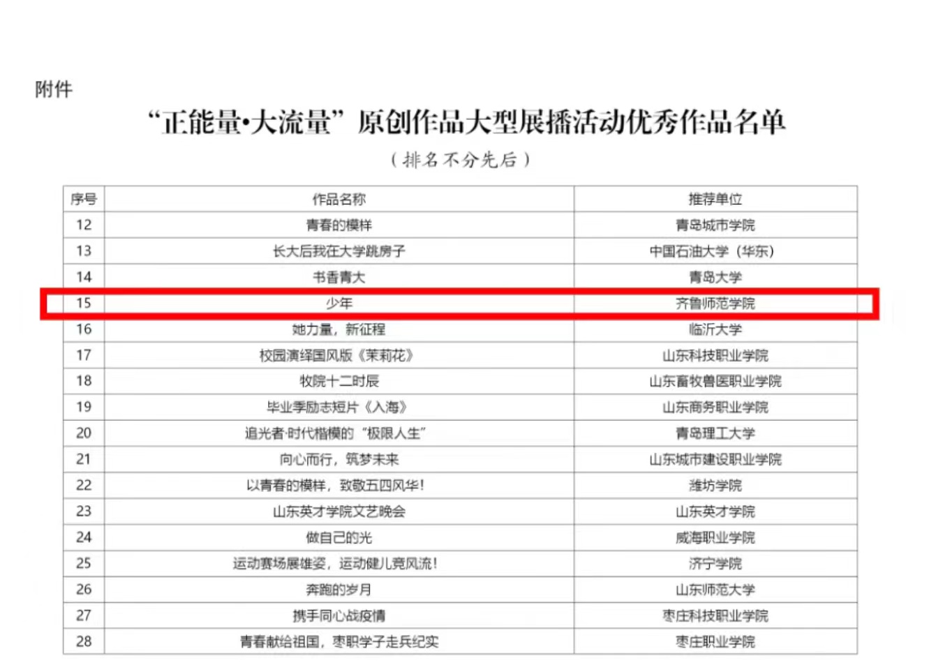近日,山东省教育厅公布“正能量·大流量”原创作品大型展播活动优秀作品评选结果,BEAT365英国官网选送的短视频作品《少年》成功入选。活动自今年3月启动,经各地各校推荐申报、专家评审等环节,全省共评选出优秀作品200件。