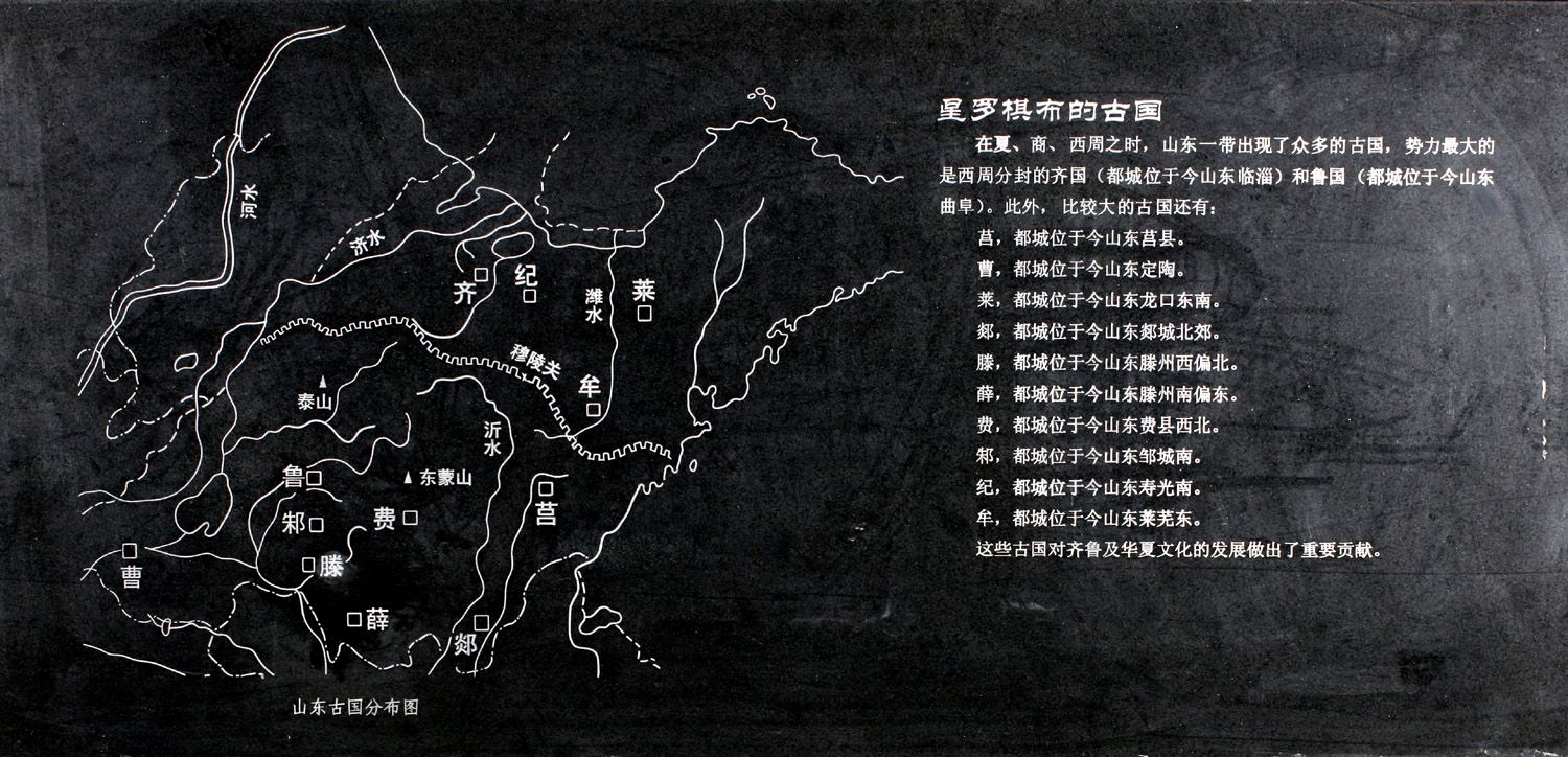 上图展示的是上古三代时期古国林立的齐鲁大地,这一块碑刻详细描绘了三代以来山东地区的诸多古国。除了齐国和鲁国之外,还有莱国、纪国、牟国、莒国、曹国、薛国、郯国等大大小小数十个国家。这些众多的国家和三代时期与实行的分封制有关。面对这些星罗棋布的古国,能够感受到古代中国的文明就像夜晚的星空,璀璨夺目,这众多的国家也是中华文明包罗万象、精彩纷呈的体现。