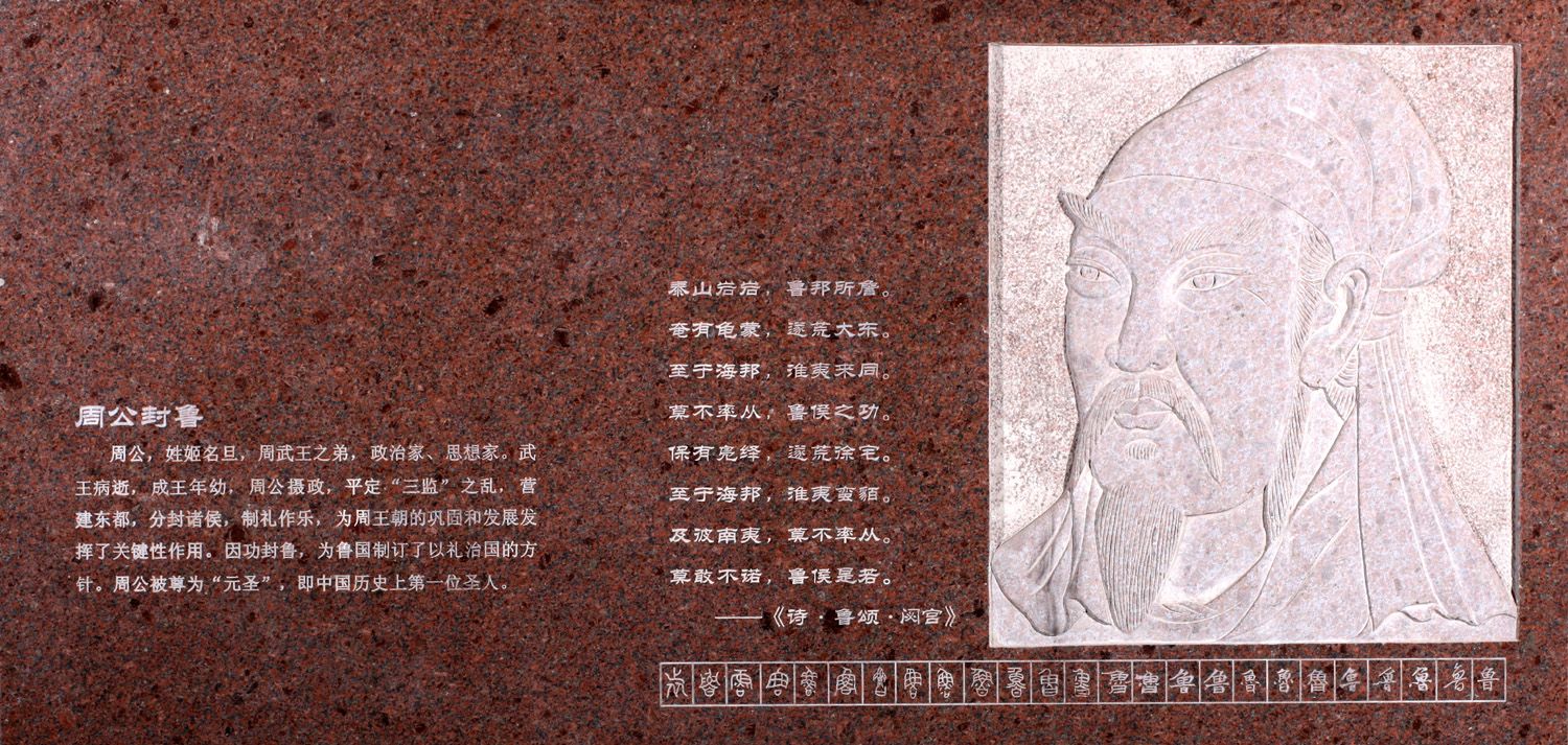 由于西周建国不久,周武王病逝,周公受命辅佐成王,所以实际受封的是周公嫡长子伯禽。鲁国靠近中原,鲁国的地理位置优越,利于国内各方面发展。说到周公,大家肯定对曹操《短歌行》中的诗句不陌生:周公吐脯,天下归心。就是说姬旦礼贤下士,迎客求才心切,进餐时听到有贤人来访多次吐出食物招待来客。同时,成王在周公的辅佐之下,制礼作乐,推行宗法制、分封制、井田制等一系列促进社会发展,稳定政局的政策和措施,尤其是平定三监之乱,亲自率军东征,为周代的长盛不衰奠定了基础。周公根据商朝灭亡的经验教训,提出了“敬天保民”“以德配天”的治国理政的思想,在中国思想史上占有重要地位,对后世帝王治国理政树立了典范,为儒家所推崇,是中国历史上一位杰出的政治家、思想家。