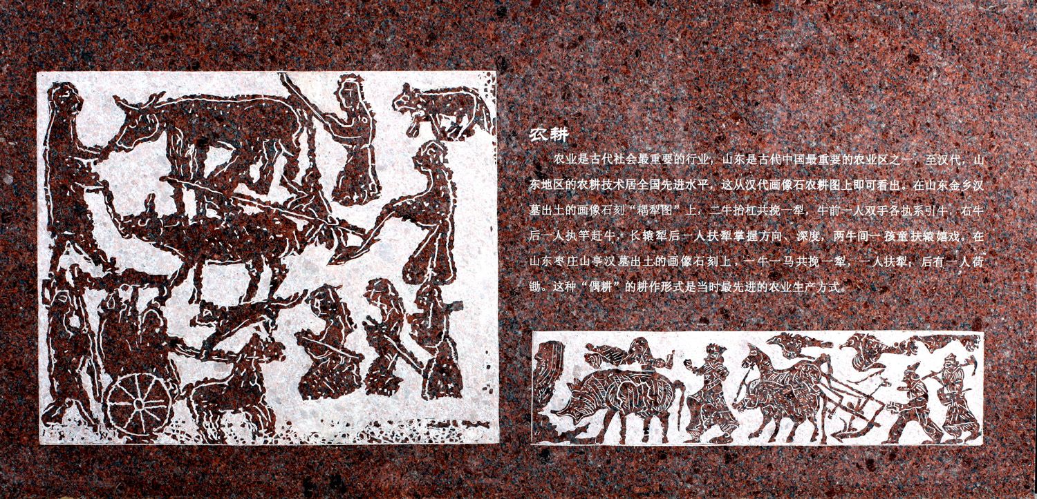 前面我们知道了汉代的文化教育十分繁荣,接下来让我们把目光转向汉代的农业。这两幅汉画像石拓片都展现了汉代当时最先进的耕作方式——耦耕,他们使用的是耦犁。耦犁是由汉武帝时期的发明家赵过发明的。左边的这副大图描绘的农耕图就是山东金乡汉墓出土的耦耕图。这张图重现了汉代农民合力耕地的场景。只见两头牛抬着杠,一起挽着一个犁。在牛的前面站着一个人,他用双手拉着牵牛的绳子来控制牛前进的方向。第二个人在牛身后一手扶着犁,一手用鞭子赶着牛往前走。还有一个人用手扶着犁,控制犁的方向和深浅。旁边有一个小孩子扶着犁嬉戏。好一个其乐融融的劳动场面。右下角这副画像则出土于山东枣庄山亭汉墓。从画像上我们可以看到一牛一马共执一犁,有一个人扶着犁,另一个人在后面背着锄头。老话常说“民以食为天”,特别是在中国的古代社会,农业是立国之本。耦犁的使用不仅提高了汉代农民耕作效率,还带来了丰收的喜悦,一幅国泰民安的繁荣景象。