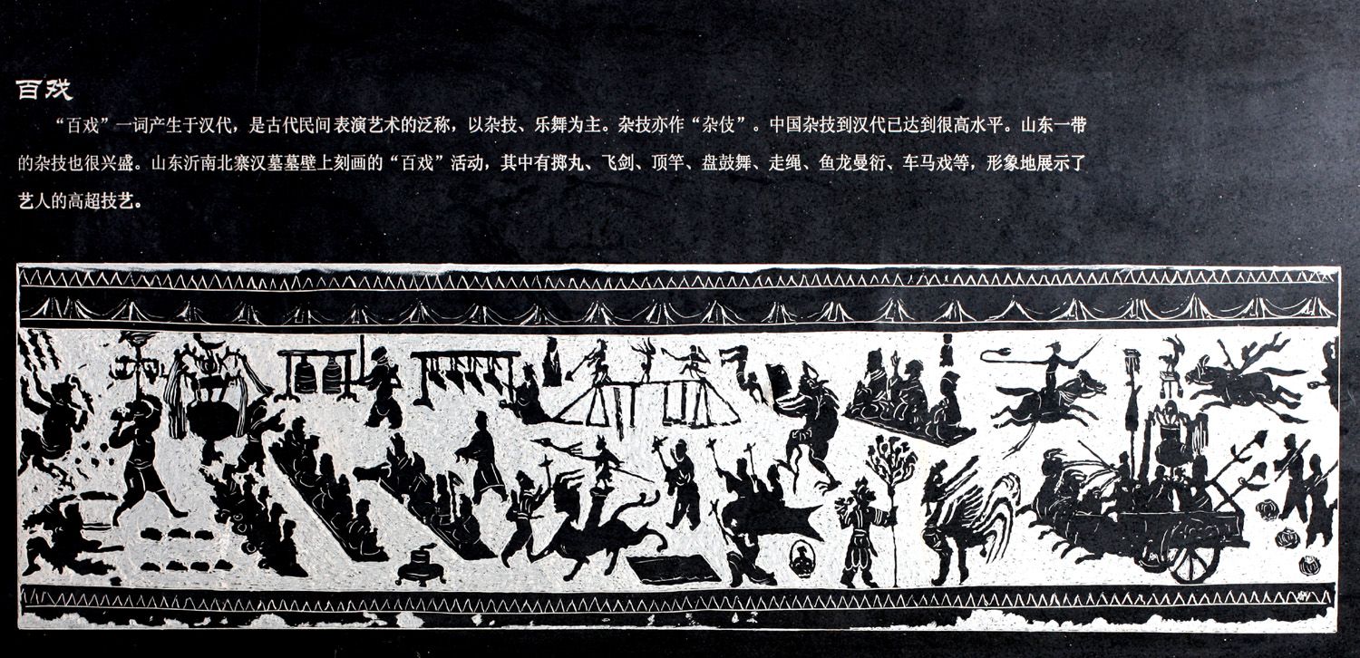 百戏——是中国古代汉民族民间表演艺术的泛称,包括歌舞、器乐、武术、杂技、魔术及杂剧等。娱乐性的艺术与多种技艺的表演形式早在先秦时即已出现,当时表演场所以宫廷为中心。汉代才出现百戏一词,其内容多种多样丰富多彩,有歌唱奏乐的化装表演,也有各种杂技项目以及马戏、驯兽、魔术等,在表演中常以俗乐伴奏。发展到宋代散乐百戏的品种已达100多种,表演的场所也进一步扩展到城市瓦肆。当时已有北宋杂剧、金院本、傀儡戏等戏曲萌芽形式的兴起和盛行。元、明、清时期,成熟的戏曲吸收了多种散乐百戏的技艺,同时这些品种经独立发展后有了专称,作为泛称的散乐百戏已渐少使用。这张图片有以下内容: