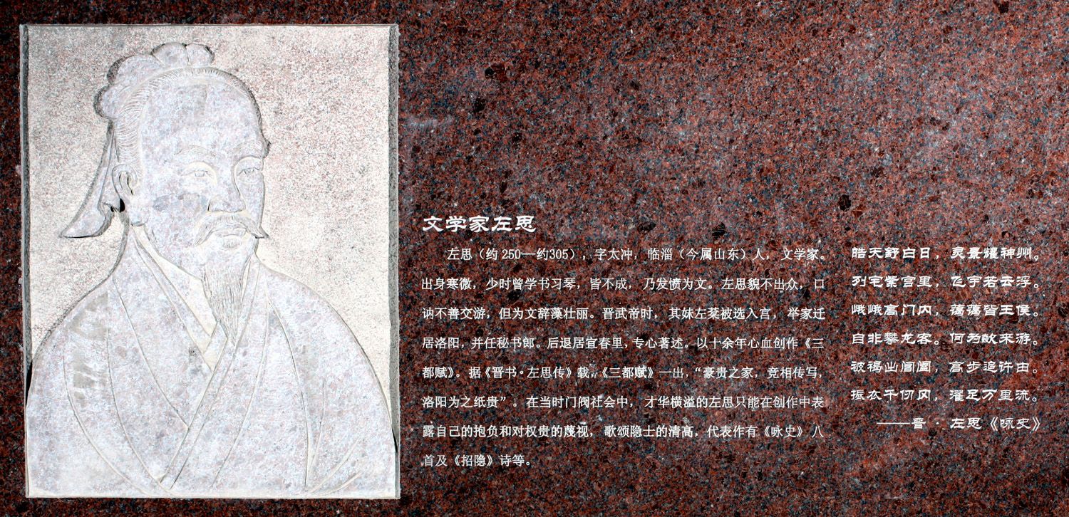 左思,字太冲,临淄人,西晋时期著名的文学家。他出生在一个世代传习儒学的家庭,父亲左雍从一个小官吏起家,一直做官做到殿中侍御史。左思自幼学习书法和鼓琴,但是在书法和音乐方面他似乎没有天赋,这样他父亲左雍很失望,有时对别人说,左思的才学不及他小时候,左思知道后,非常难过,同时也鞭策了他勤奋努力的学习。左思其貌不扬,口讷,不善表达,但是他却是拥有超凡脱俗的文学才华,他的作品辞藻壮丽,他专心于著作,以十余年的心血创作了与班固的《二都赋》、张衡的《二京赋》齐名的《三都赋》,所谓的《三都赋》指的是三国时期魏蜀吴的都城的歌颂。