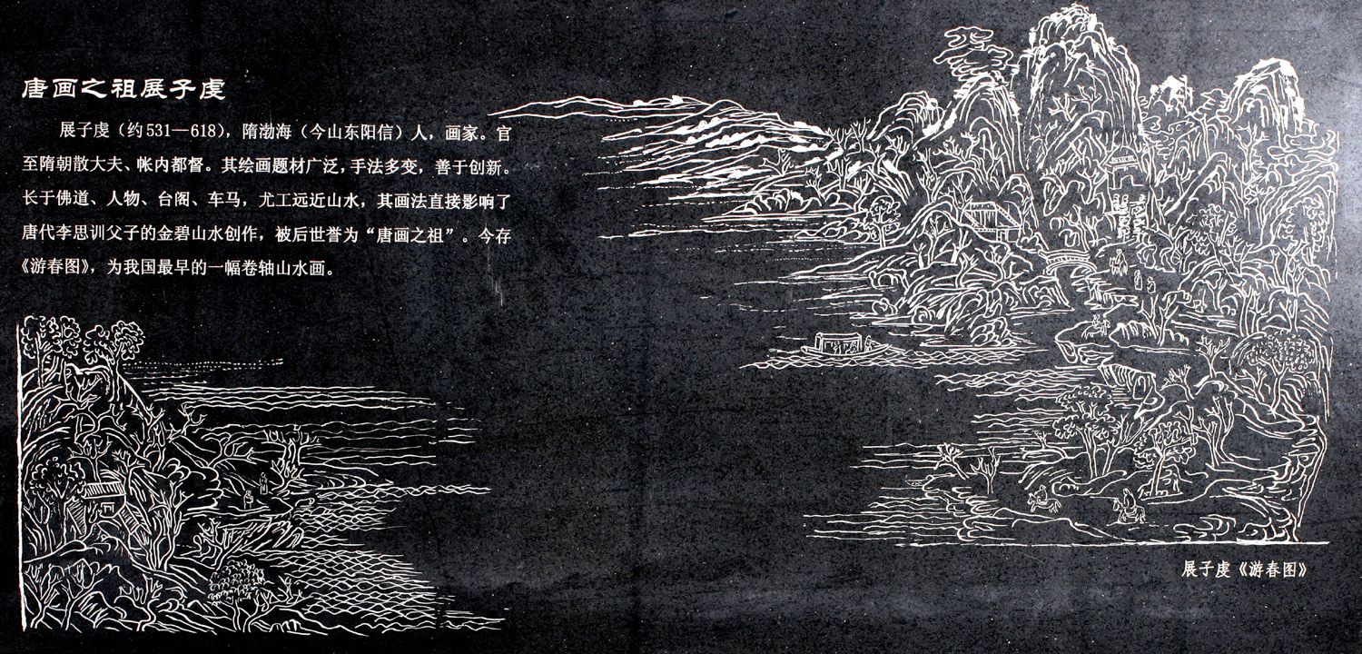 这块石碑介绍的是唐画之祖展子虔和他的代表作《游春图》。