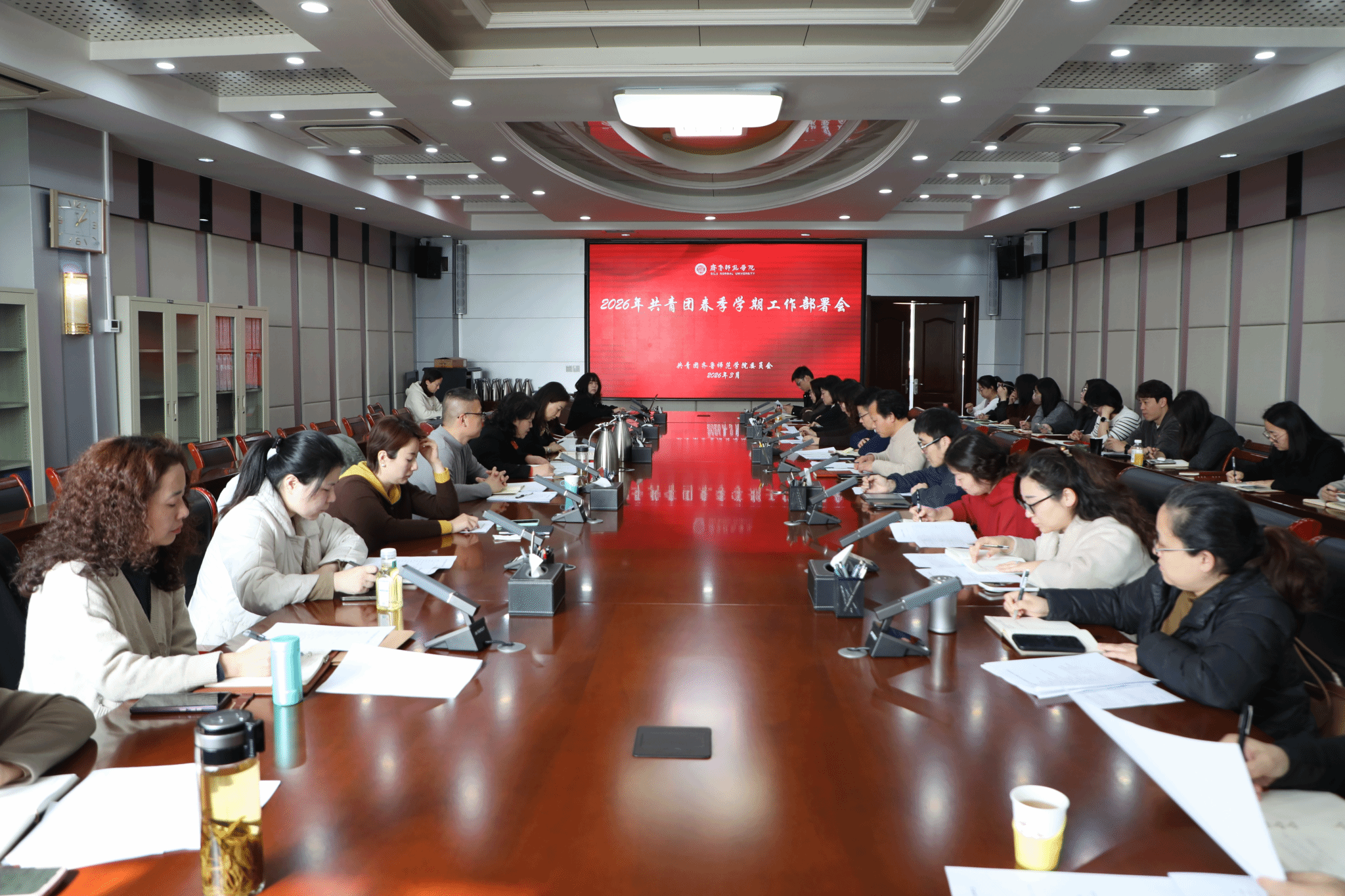团委负责人对2026年春季学期重点工作进行了全面部署。学前教育学院、外国语学院、化学与化工学院、美术学院团总支书记依次围绕社团建设、社会实践、基层组织建设及第二课堂开展情况进行工作汇报,并就下一步工作计划作详细阐述。