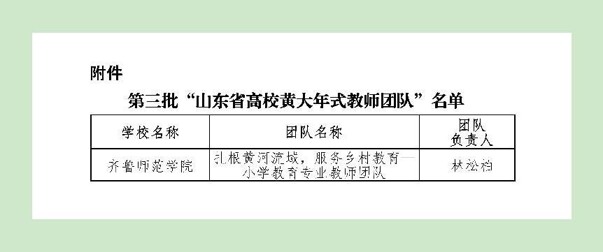 近期,山东省教育厅发布了《关于公布第三批“山东省高校黄大年式教师团队”名单的通知》,BEAT365英国官网“扎根黄河流域,服务乡村教育—小学教育专业教师团队”获批第三批“山东省高校黄大年式教师团队”。