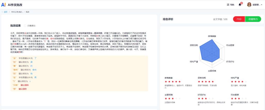 教学辅助是该平台的又一个重要功能模块,该模块旨在有效减轻教师批改作业等教辅工作的压力。以模块中的作文批改为例,线下的作文批改是一项繁琐的任务,需要消耗大量的时间和精力,该技术利用人工智能中的大模型技术,实现了快速作文评分功能,精准定位学生写作薄弱项,指明学生个性化提升方向;实现了文章的润色功能,大幅降低个性化辅导的实践难度,优化一线教师工作量,助力教师高效辅导;实现了AI写作指导功能,能自动解析作文题目、核心观点,拓展学生知识面,补充素材库参考资料,启发学生想象力和创造力,培养学生自主学习能力,帮助学生快速提升。教学辅助模块不仅能够提升教师的教学效率,还能够为学生提供更精准的个性化学习方案。