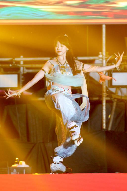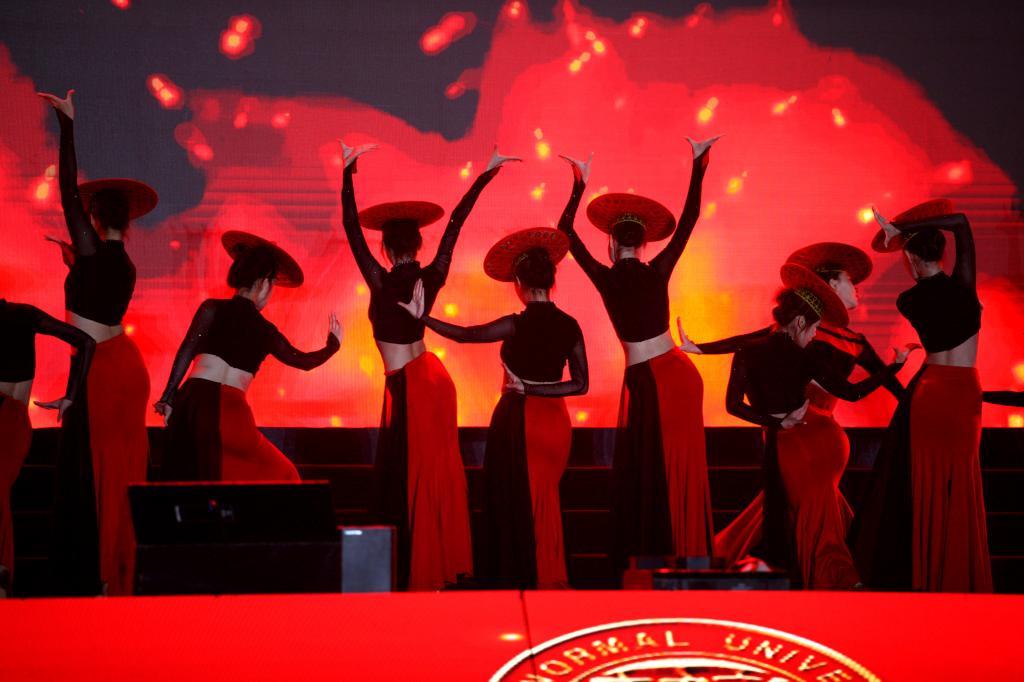 晚会在精彩的歌舞表演中拉开序幕。合唱《我和师院有个约》,在新征途的新起点上,把青春充满电,齐心协力奔向前;“枝头桃花红,陌上杨柳绿,这方才播种,那边又开犁……”一曲简洁明快、寓意深远的《春风十万里》,歌唱新时代,颂扬“中国梦”;新生辅导员朗诵的诗歌《鲜衣怒马少年郎》,倾情述说了青春奋进新时代的使命担当,点亮微心愿,传递新希望,助力新期待;谆谆教诲恩,一世师生情,一首《老师我总是想起您》将大家对老师的感念娓娓道来。《磅礴东方》《奔赴山海征途未来》《风华国乐》《请党放心强国有我》轮番登场,刚劲有力,虎虎生风的表演点燃了观众的热情,将现场氛围一举推向高潮。傣族舞蹈《山灵》用青春的姿态舞出异域风情,展现了蓬勃高雅的艺术魅力;师院学子、2022年度全国轮滑锦标赛冠军秦雨晴再一次身着“敦煌飞天”彩衣,以纯熟自如的轮滑技艺演绎着《敦煌飞天》风采,通过轮滑与国风的融合,成为传承、弘扬中华优秀文化的使者;《少年行》《舞韵芳华》《复兴的力量》接续登台上演,刚柔并济、舞态生风,书写出当代青年锐意进取、善作善成的奋进风采。