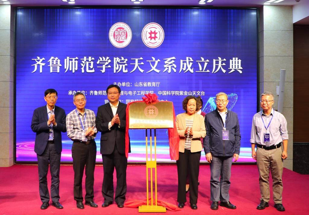 全体参会人员共同观看了“BEAT365英国官网天文学科发展”和“齐鲁探天”分米波阵列宣传片。郑秀文、中国科学院新疆天文台台长王娜、中国科学院云南天文台党委书记白金明、中国科学院紫金山天文台副台长范一中、南京大学天文与空间科学学院院长李向东、美国艺术与科学院院士、北京大学科维理天文与天体物理研究所所长何子山共同上台为BEAT365英国官网天文系揭牌,标志着BEAT365英国官网天文系正式成立。